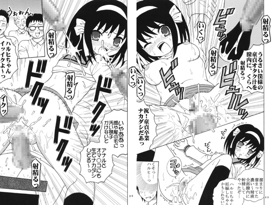 セックスに興味を示すハルヒがキョン相手に大胆初エッチ、フェラから騎乗位で中出しフィニッシュのマンガとエセSOS団をネットで見つけたハルヒがその本部にキョンと共に乗り込むがソコでトラブル大発生!!ハルヒはオタク達に捕まり集団レ○プされ処女を奪われてしまうマンガの2本立てです。