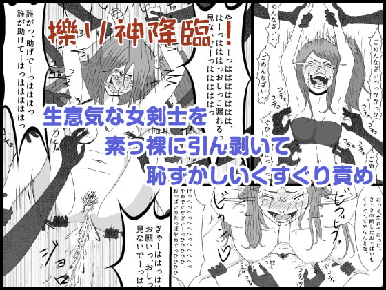 母親のかたき討ちのために、村一番の女剣士が、この擽り神の討伐に挑むも、簡単に負けてしまい、くすぐり責めのお仕置きにあう。両手両足を押さえつけられ、弱点の脇腹や脇の下、足の裏をくすぐられ、何度も何度も「ごめんなさい」をさせられる。